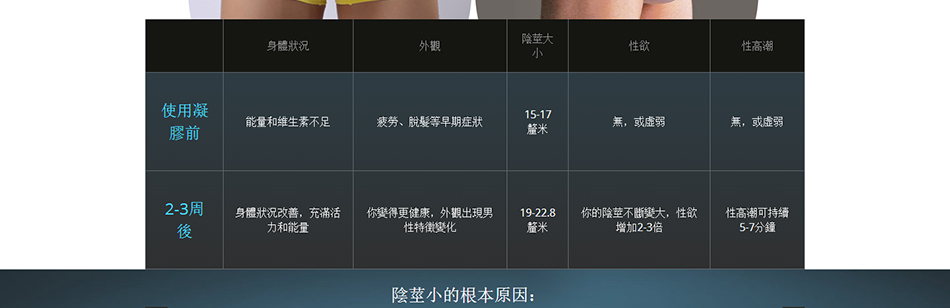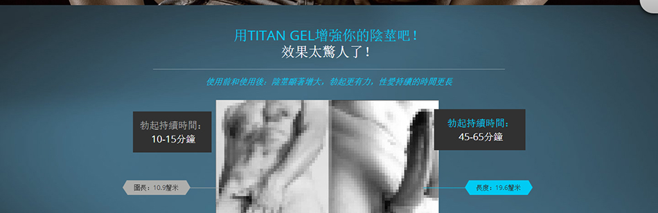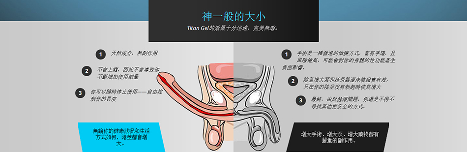 因為研發出了Titan Gel的配方,男人不再受到陰莖短小煩惱,不再需要做昂貴且危險的手術。男性性器官大小的增加是逐步的,但是有保證的。使用一個月後,陰莖的長度可以平均