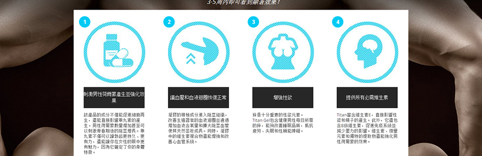 Titan Gel產品在體內引發爆炸式的效果。即刻刺激睾丸酮的分泌,使整個身體更加強壯。